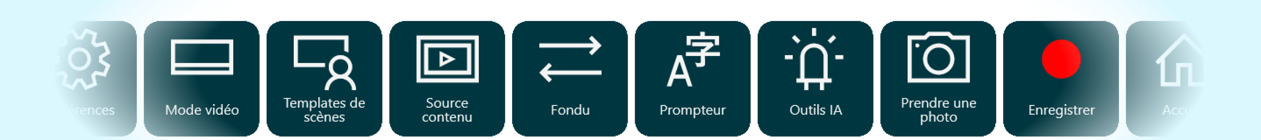 Naviguez dans le menu de votre studio Rapidmooc comme sur votre smartphone, en accédant à toute une série d'applications prêtes à l'emploi adaptées à vos besoins spécifiques en matière de tournage.