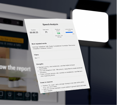 Posture, voix, impact : vos prises de parole vidéo sont analysées automatiquement après chaque tournage. En quelques secondes, vous recevez un rapport clair, actionnable et sur mesure, pour développer vos compétences, gagner en impact et en confiance, vidéo après vidéo.